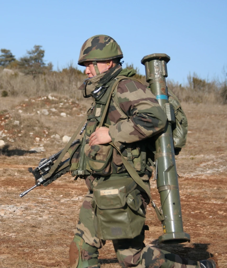 Fantassins français en position de tir avec un lance-roquette Apilas. Arme antichar standard à la fin des années 1980 et dans les années 1990.